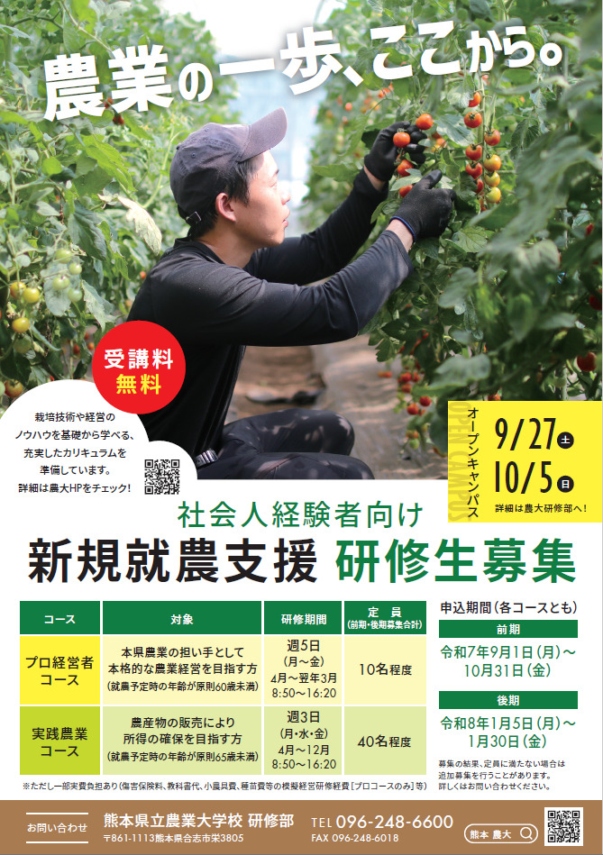 | お問い合わせお申し込み | 熊本県立農業大学校研修部 ☎ 096-248-6600 |